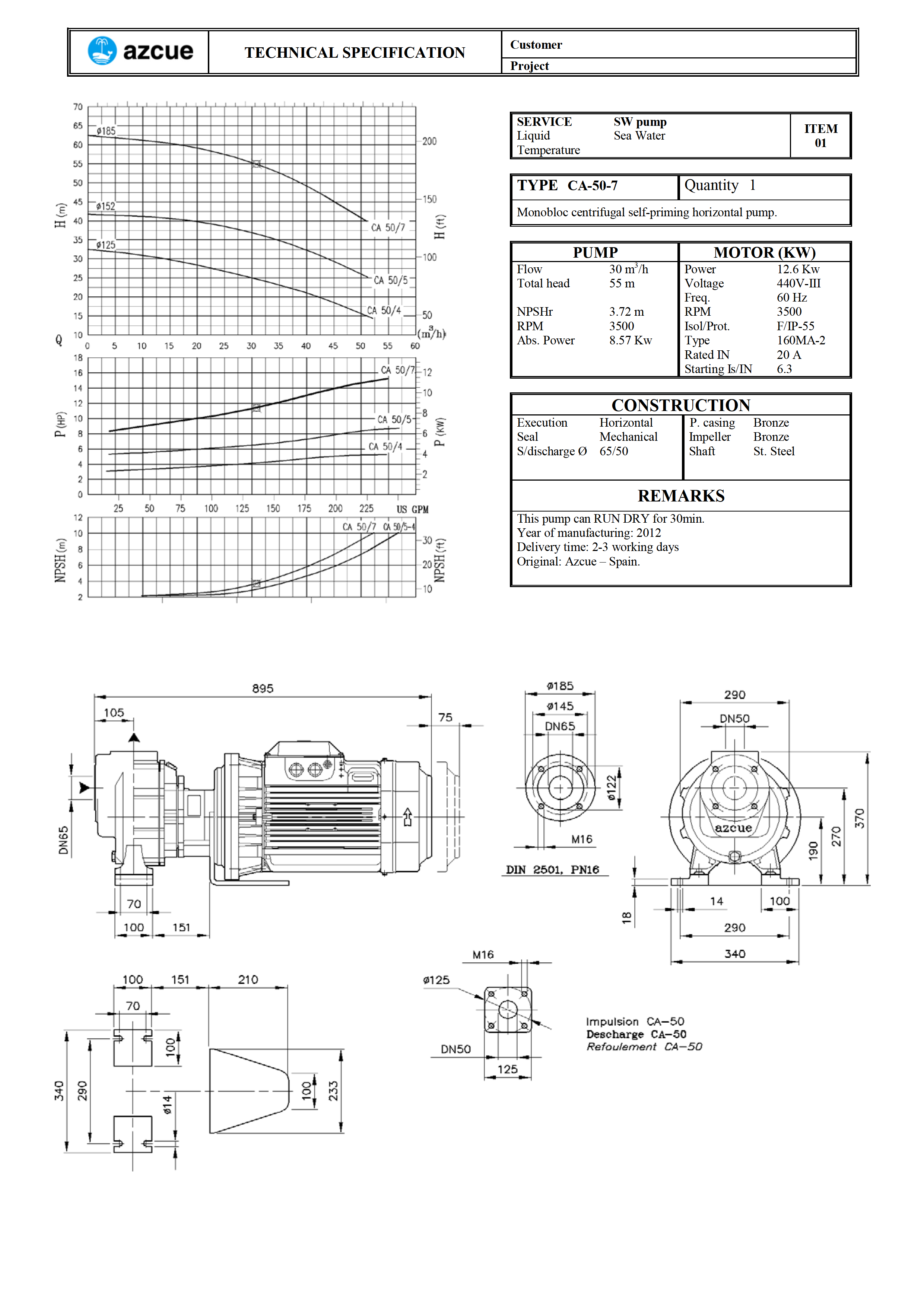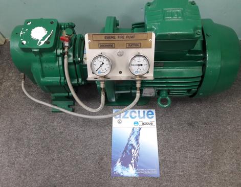 Bơm chữa cháy Azcue CA-50-7, công suất 12.6 kW, lưu lượng 30 m³/h, cột áp 55m, tốc độ vòng quay 3500 RPM. Vận hành bằng động cơ điện 440V - 60Hz, có khả năng chạy khô đến 30 phút, vật liệu chế tạo đồng, thép không gỉ, đảm bảo độ bền và chống ăn mòn cao. Bơm đạt tiêu chuẩn quốc tế, sẵn hàng, giao nhanh 2-3 ngày. Năm sản xuất: 2012, chưa sử dụng.